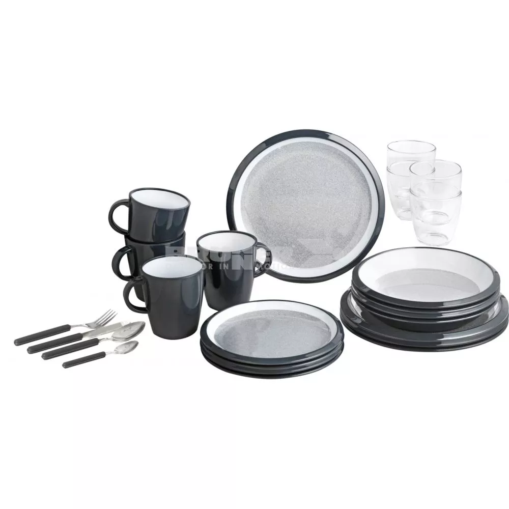 Mit dem Campinggeschirr-Set Brunner All Inclusive Granyte erhältst du eine umfangreiche 36-teilige Grundausstattung für 4 Personen, ideal für den täglichen Gebrauch auf dem Campingplatz. Für einen schön gedeckten Tisch ist farblich alles passend aufeinander abgestimmt. Das Set beinhaltet Essteller, Suppenteller, Kuchen- bzw. Desserteller, Henkelbecher, grosse Trinkbecher und ein Besteckset mit Gabeln, Messern, Löffeln und Kaffee- bzw. Dessertlöffeln.