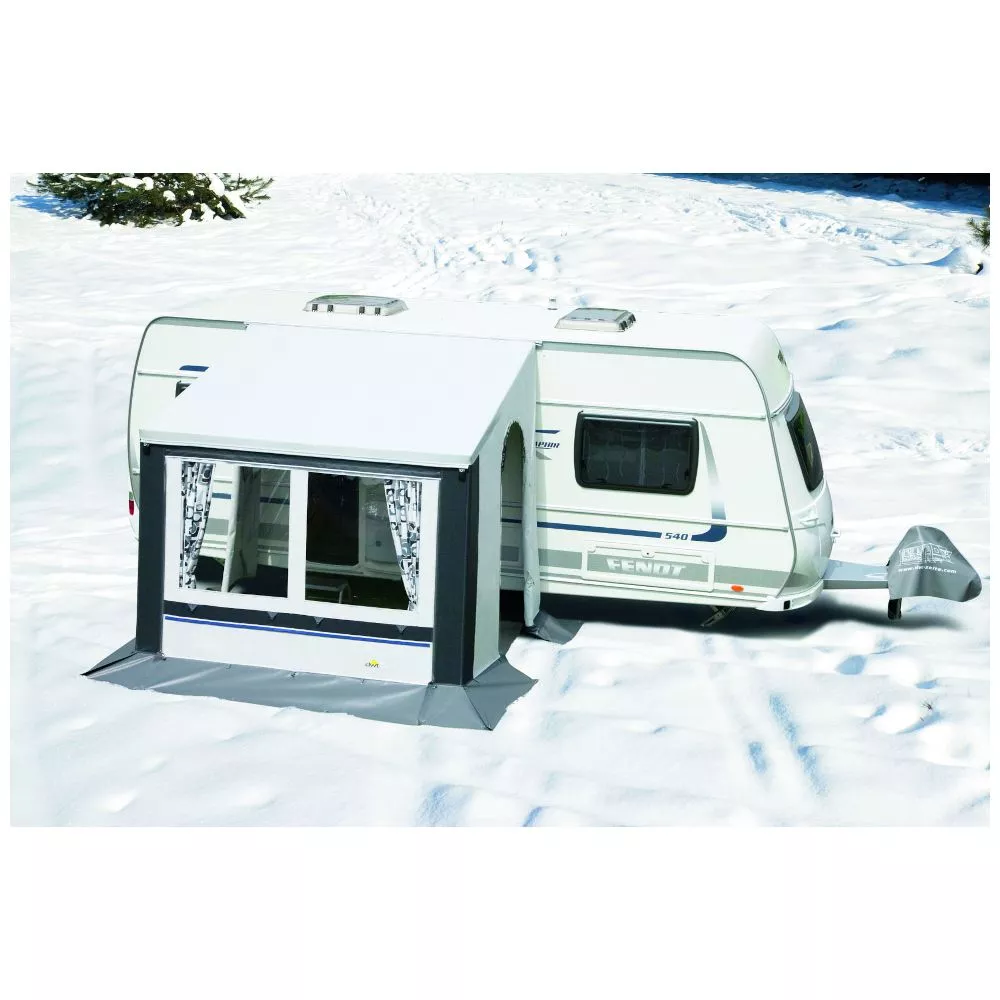 Das Vorzelt dwt Cortina III begeistert alle Fans vom Wintercamping. Sehr strapazierfähige Materialien, ein robustes Stahlgestänge und durchdachte Details machen das Wohnwagenvorzelt Cortina zur perfekten Unterkunft rund ums Jahr. Über das glatt abschliessende Dach ohne Überstand rutscht der Schnee einfach ab. Zudem sorgen volumenreiche Schaumstoffwülste, die per Klett und Flausch montierbar sind, für eine perfekte Abdichtung.