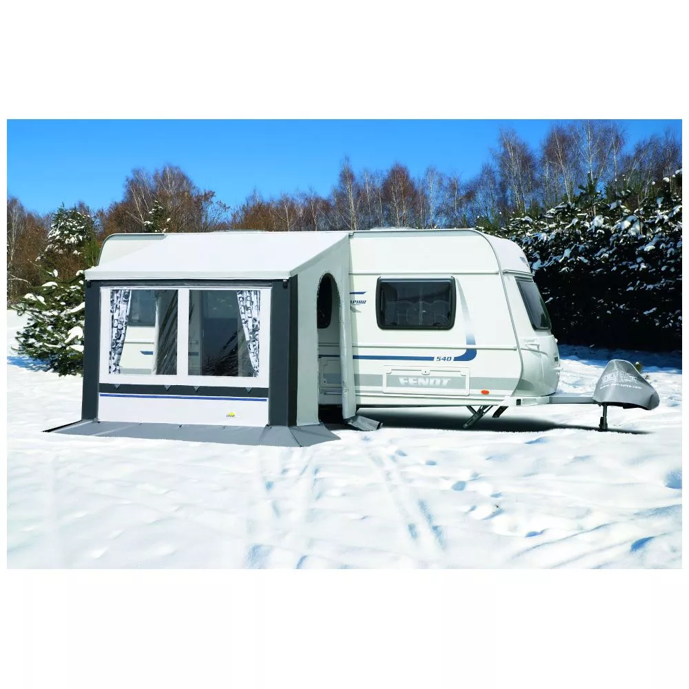 Das Vorzelt dwt Cortina III begeistert alle Fans vom Wintercamping. Sehr strapazierfähige Materialien, ein robustes Stahlgestänge und durchdachte Details machen das Wohnwagenvorzelt Cortina zur perfekten Unterkunft rund ums Jahr. Über das glatt abschliessende Dach ohne Überstand rutscht der Schnee einfach ab. Zudem sorgen volumenreiche Schaumstoffwülste, die per Klett und Flausch montierbar sind, für eine perfekte Abdichtung.