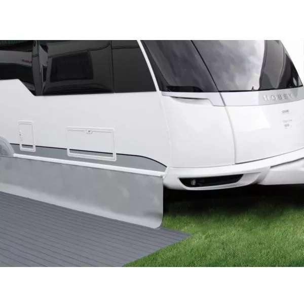 Die hochwertige Hindermann Bodenschürze / Windblende Premium aus winterfester Planenware schafft mehr Wohnqualität im Wohnwagenvorzelt, unter dem Sonnendach oder der Markise. Sie dient als Wind- und Sichtschutz zugleich. Die hochbelastbaren, eingeschweissten und nicht rostenden Ösen sorgen für zuverlässige, dauerhafte Befestigung am Wohnwagen.