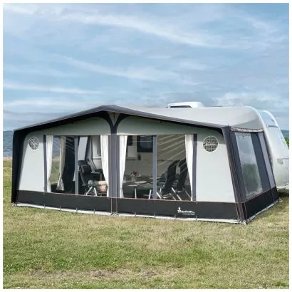 Das WohnwagenVorzelt Isabella Commodore Coast G19 A510 Averso P 2010-2017 in stilvollem und modernem Design bietet ausreichend Platz für die ganze Familie. Das atmungsaktive Isacryl-Gewebe in den Vorder- und Seitenwänden sorgt in Verbindung mit dem einseitig beschichtetem Dach (Textilunterseite) für ein gutes Raumklima. An heissen Tagen können die Vorder- und Seitenwände einfach zur Veranda abgeklappt oder komplett herausgenommen werden, so dass ein grosses Sonnendach entsteht. Mit 300 cm Tiefe bietet dieses Caravanvorzelt viel Platz zum Einrichten eines gemütlichen Wohnbereichs mit Essecke und zum Entspannen für die ganze Familie. Dank dem leichten CarbonX-Glasfibergestänge wird dem Vorzelt eine gute Stabilität verliehen und es eignet sich bestens fürs Reise- und Saisoncamping.