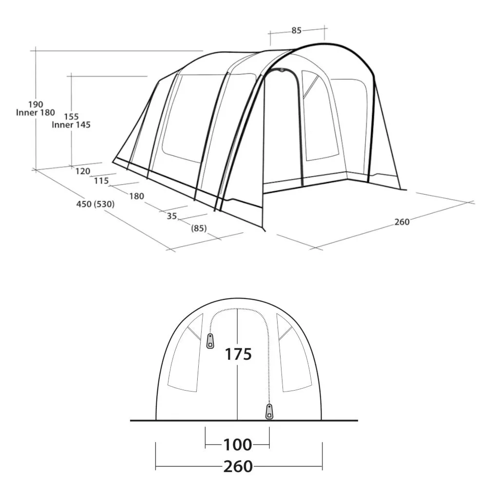 Die vertikale Vorderwand bietet dank Überdachung einen regengeschützten Eingang mit aufrollbarem Seitenschutz. Mit einer angenehmen Innenraumhöhe von 180 cm liefert die clevere Tunnelkonstruktion viel Platz im Zelt. Der grosse Wohnraum eröffnet zahlreiche Wohn- und Staumöglichkeiten.