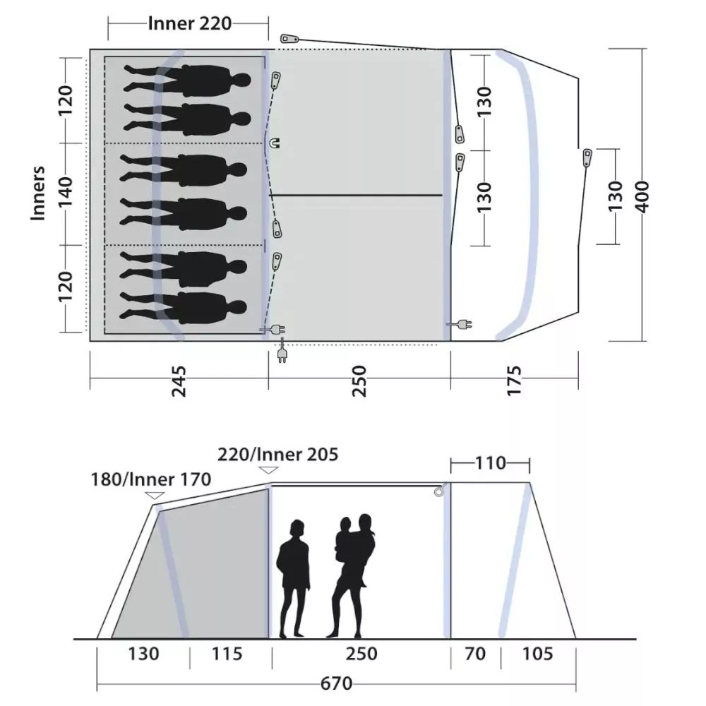Der als Zubehör erhältliche, passgenau zugeschnittene Teppich sorgt für noch mehr Komfort. Und die passgenaue Unterlage schützt den Zeltboden vor Abrieb und Schäden von unten und isoliert gleichzeitig gegen Bodenkälte. Erweitere das Sacramento 6 Air mit dem optional erhältlichen Outwell Canopy Tarp L und erhalte so noch mehr wettergeschützten Platz. Der ebenfalls zusätzlich erhältliche Outwell Lounge XL Tent Connector ermöglicht es dir, dein Zelt mit einem Outwell-Pavillon zu verbinden.