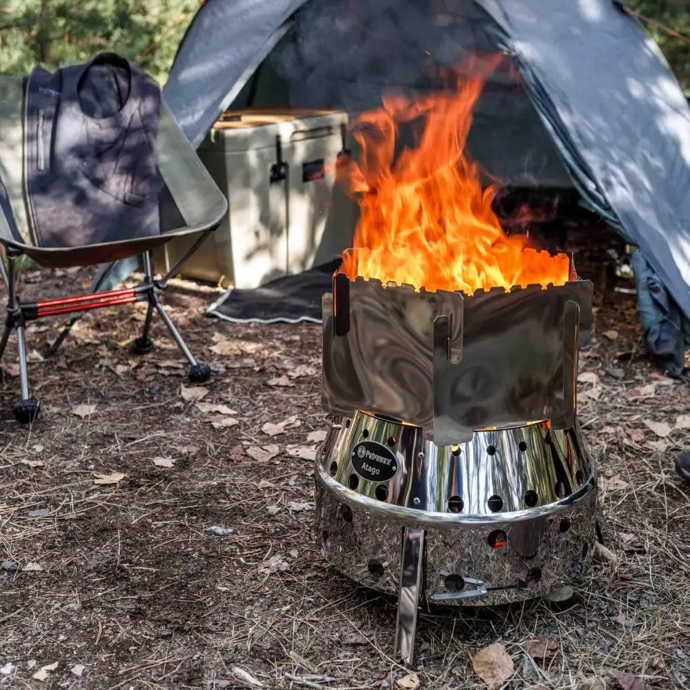 Ganz unkompliziert kannst du bis zu sechs Edelstahl-Segmente zu einem Reflektorschild am Rand des Atago-Grills zusammenfügen. So bestimmst du die Grösse selbst. Diese Segmente reflektieren die Wärme des Feuers zur Mitte, während die äussere Seite angenehm kühl bleibt. Freunde und Familie können sich entspannt neben dem Atago versammeln, geschützt vor der Hitze. Dank der Öffnung in der Mitte lassen sich Holz, Kohlen oder Briketts einfach nachlegen.