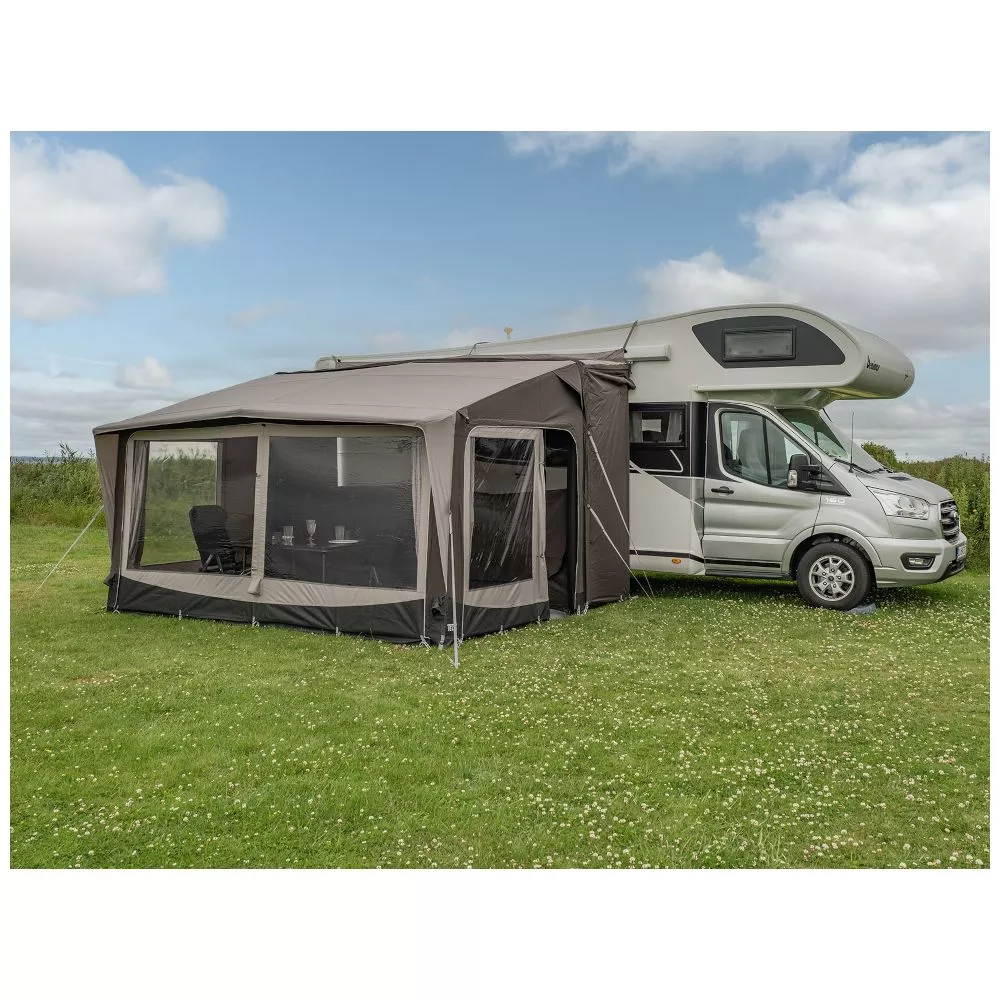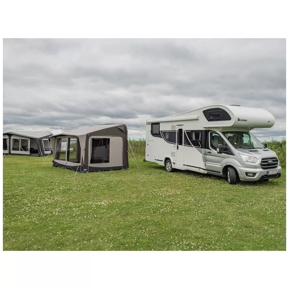 Die freistehende Konstruktion ermöglicht den Aufbau an jedem beliebigen Ort und eine Vielzahl von separat erhältlichen Tunneloptionen sorgt für eine perfekte Anpassung an deinen Kastenwagen, dein Wohnmobil oder deinen Liner. Wenn das Abenteuer ruft, trennst du einfach den Tunnel ab und lässt dein Vorzelt als Wohlfühlraum für die bequeme Ankunft nach der Expedition stehen. Panoramafenster, die bei Bedarf mit Gardinen verschlossen werden können, runden den Komfort dieser Wohlfühloase ab.