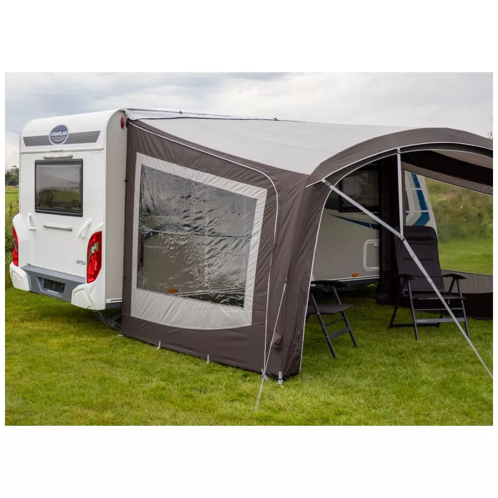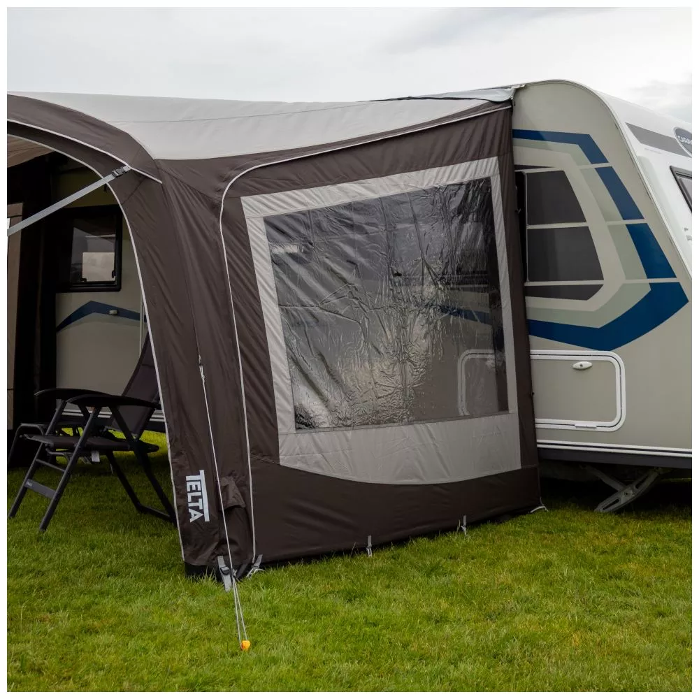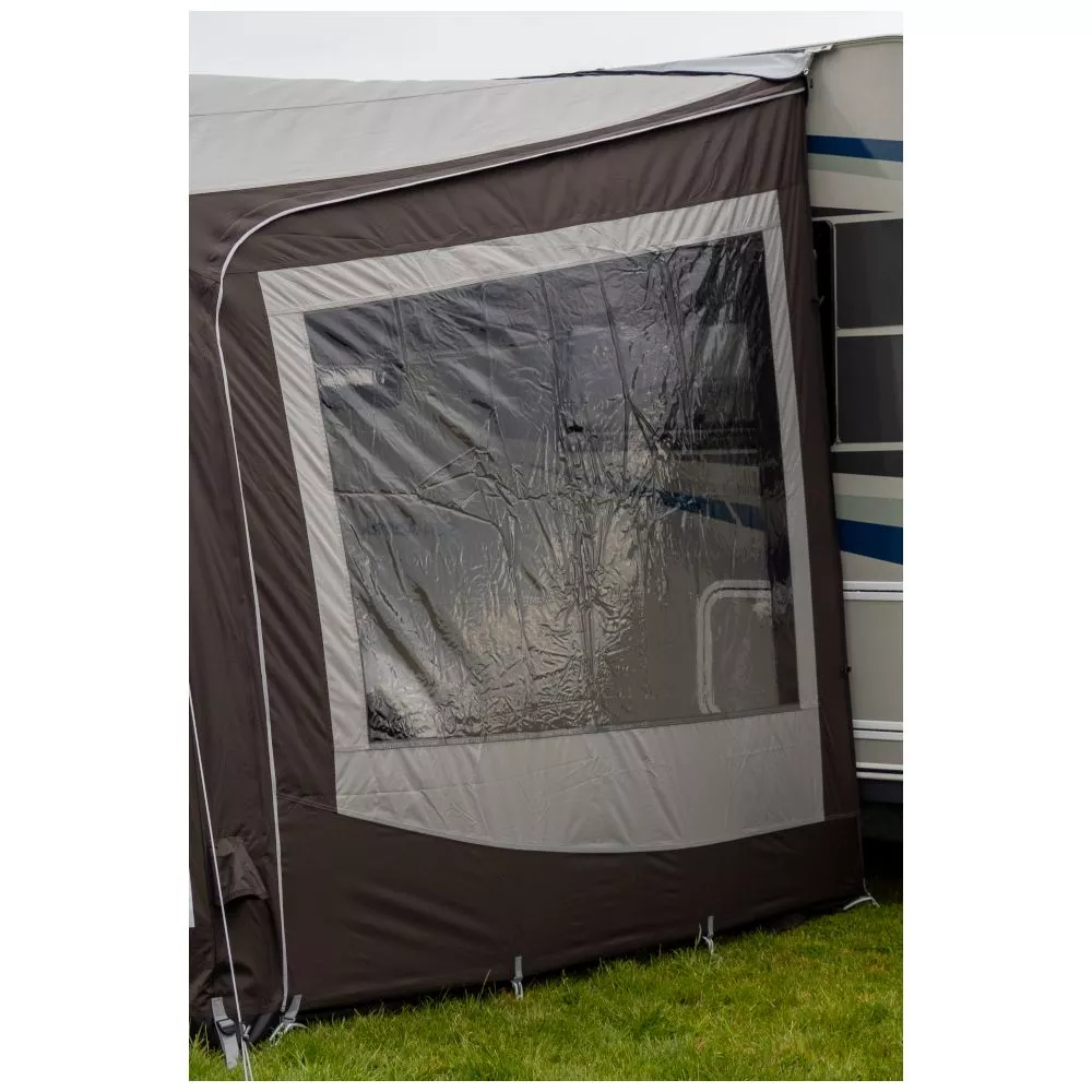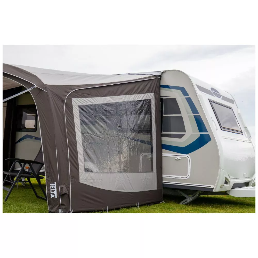 Die Telta Sky Link 330 / 400 Seitenwände sind die perfekte Ergänzung für deine Sky Link 330 oder 400 Wohnwagen Sackmarkise bei schlechtem Wetter. Befestigt werden die Seitenteile einfach mittels Reisverschluss an der Markise. Dank der Panoramafenster gelangt auch bei geschlossenen Seiten viel Tageslicht nach innen und dir wird weiterhin ein gigantischer Blick in die Natur ermöglicht. Zudem bieten die Side Panels einen guten Windschutz. Durch das geringe Gewicht und Packmass finden die Seitenwandpaneele jederzeit ihr Plätzchen in deiner Wohnwagenausrüstung.