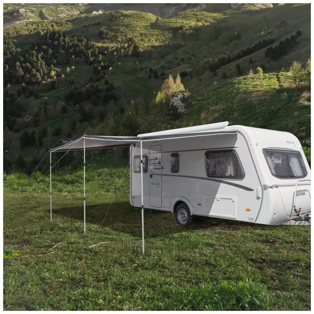 Mit dem Westfield Canopy Shady Pro erweiterst du zu dein Westfield Vega 330 / 2.0 oder Mars Vorzelt um ein praktisches Sonnendach. Alternativ bringst du das Westfield Canopy direkt an deinem Wohnwagen an. Dank der Tiefe von 220 cm und dem hochwertigen HydroTech-Ripstop-Material schützt dich das Canopy Shady Pro zuverlässig vor Sonne und Regen. Mithilfe der 3 stufenlos höhenverstellbaren Aufstellstangen und 4 Abspannleinen ist dieses Sonnenvordach sehr einfach und schnell aufgebaut.